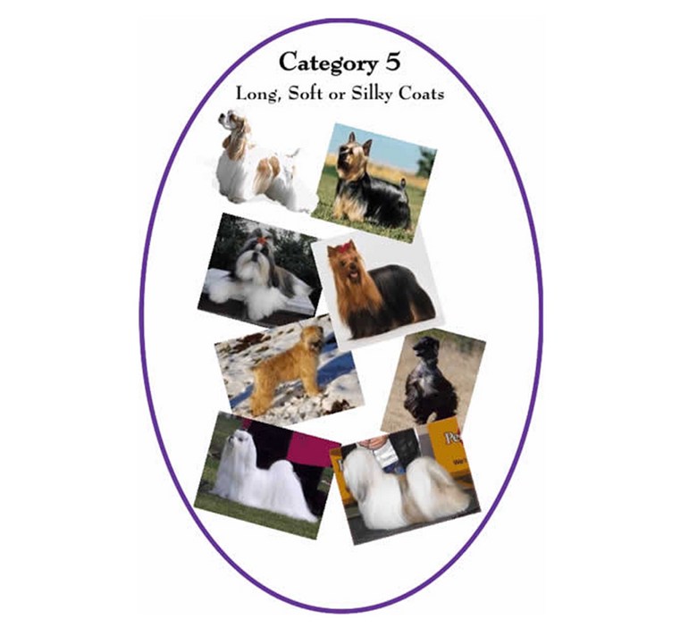 Fundamentally, categories range from short / medium coated breeds, (with or without fringing), through to bouffant, coarse, harsh / hard , and silky / flowing.